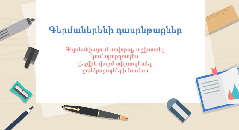 Գերմաներենի դասընթացներ բոլոր նրանց համար, ովքեր ցանկանում են ուսումը շարունակել, աշխատել Գերմանիայում կամ պարզապես լավ տիրապետել լեզվին: Դասընթացները կազմակերպվում են խմբակային, անհատական և առցանց տարբերակներով:
